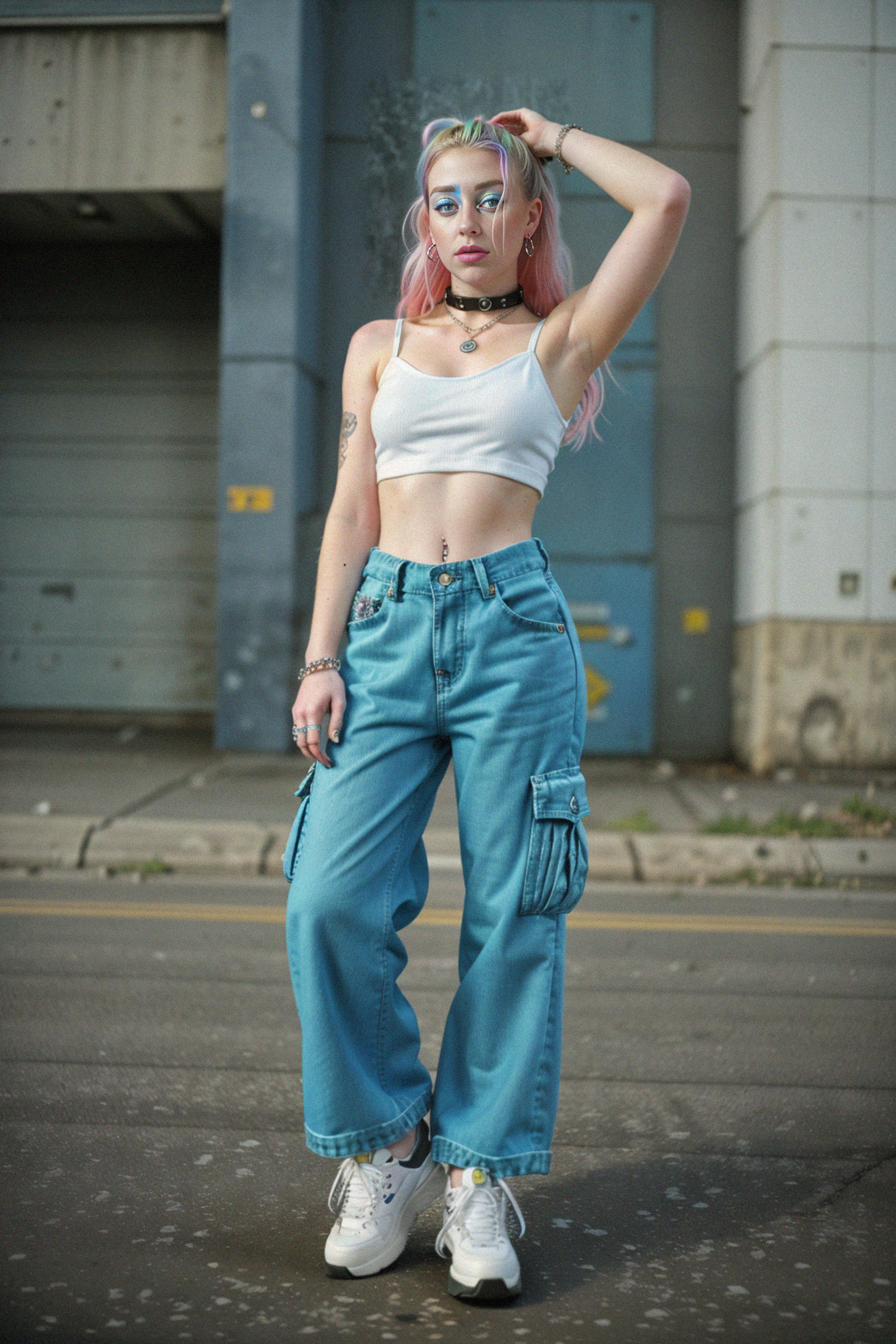 model wearing Y2K aesthetic, 2000s fashion, aughts style, noughties style, grunge or 2000s style, oversized washed out style, baggy pants, low rise pants or cargo pants, crop top, Choker, Metallic, iridescent fabrics, posing for photo
