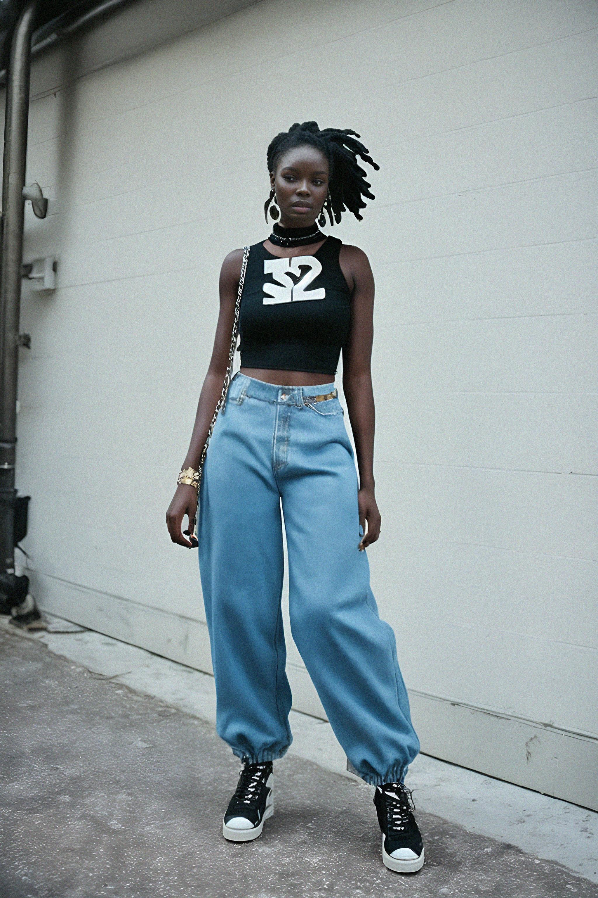 model wearing Y2K aesthetic, 2000s fashion, aughts style, noughties style, grunge or 2000s style, oversized washed out style, baggy pants, low rise pants or cargo pants, crop top, Choker, Metallic, iridescent fabrics, posing for photo