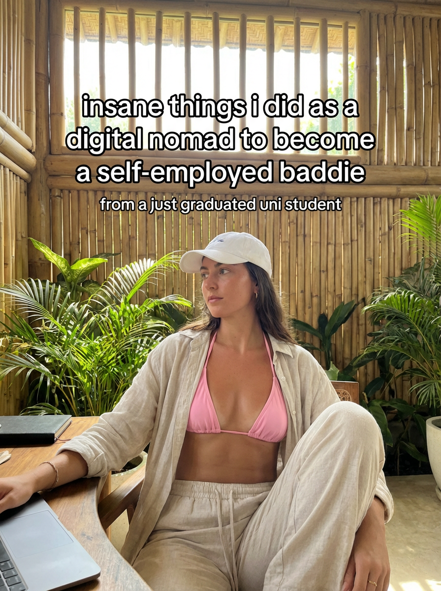 model white cap wearing pink string bikini with ponytail , in a balinese coworking studio, bamboo walls, lush tropical plants, sunlight pouring through high windows, vibrant tropical decor, wearing relaxed business attire, thoughtful expression, soft natural lighting, candid workspace vibe. TikTok-style text overlay with white text with black outline: "insane things i did as a digital nomad to become a self-employed baddie" and small letters below "(from a just graduated uni student)" , do not show tiktok interface or logo