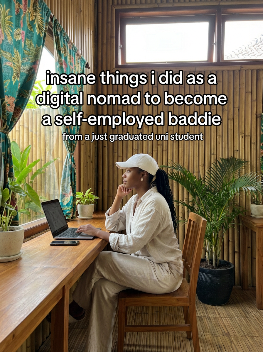 model white cap wearing pink string bikini with ponytail , in a balinese coworking studio, bamboo walls, lush tropical plants, sunlight pouring through high windows, vibrant tropical decor, wearing relaxed business attire, thoughtful expression, soft natural lighting, candid workspace vibe. TikTok-style text overlay with white text with black outline: "insane things i did as a digital nomad to become a self-employed baddie" and small letters below "(from a just graduated uni student)" , do not show tiktok interface or logo