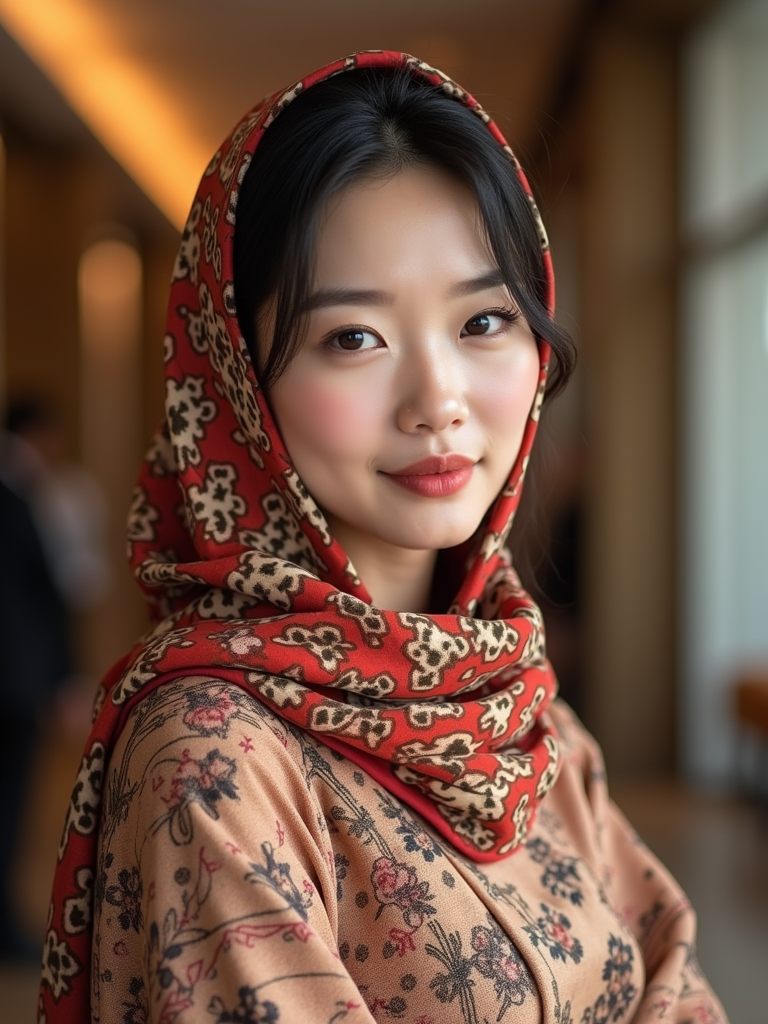 model with a designer logo silk scarf tied to completely cover the hair, with glowing skin , in a luxury hotel lobby