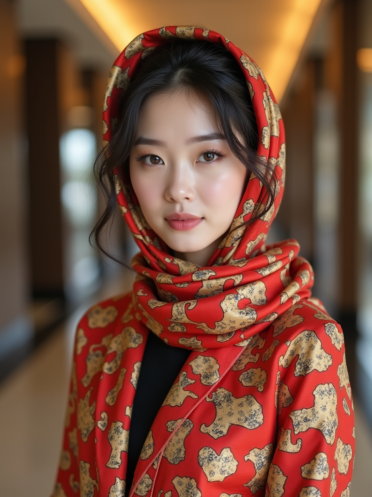 model with a designer logo silk scarf tied to completely cover the hair, with glowing skin , in a luxury hotel lobby