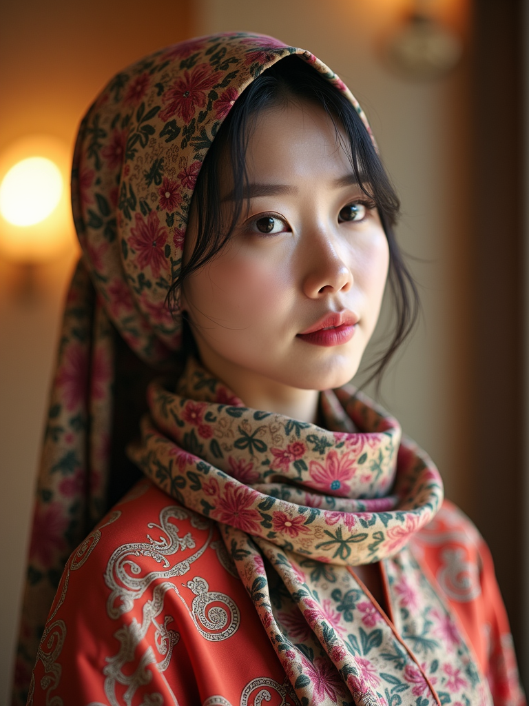 model with a designer logo silk scarf tied to completely cover the hair, with glowing skin , in a luxury hotel lobby