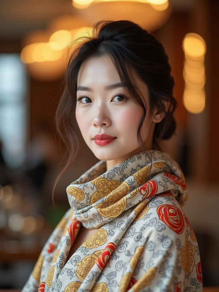 model with a designer logo silk scarf tied to completely cover the hair, with glowing skin , in a luxury hotel lobby