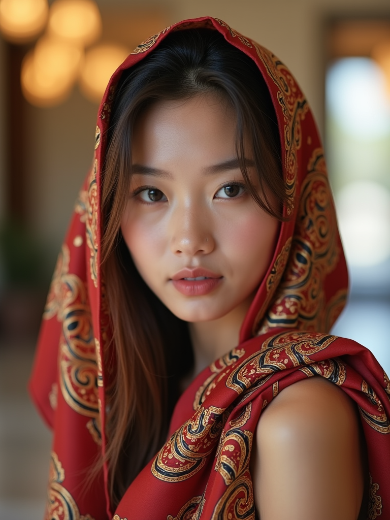 model with a designer logo silk scarf tied to completely cover the hair, with glowing skin , in a luxury hotel lobby