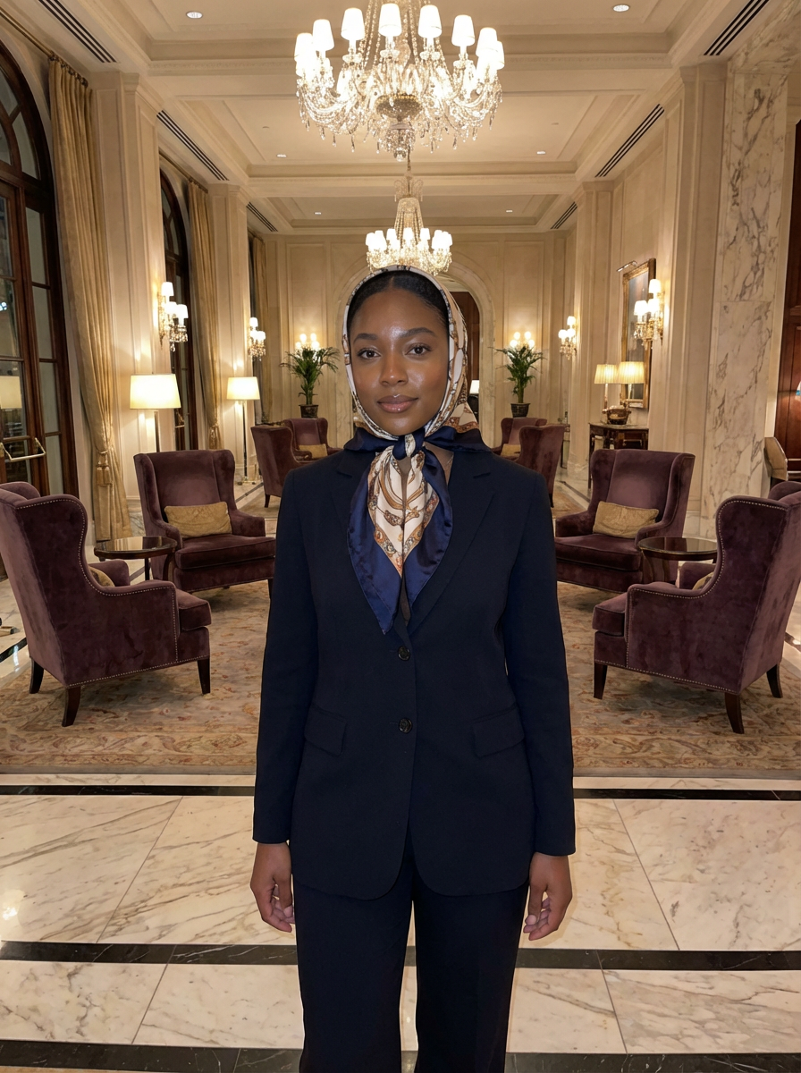 model with a designer logo silk scarf tied to completely cover the hair, with glowing skin , in a luxury hotel lobby