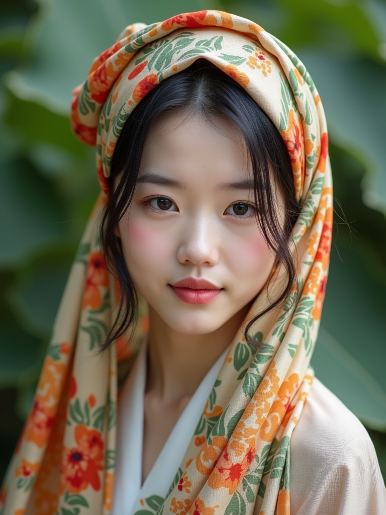 model with a floral silk scarf wrapped around the head covering all hair, with natural-looking makeup , in a botanical garden setting