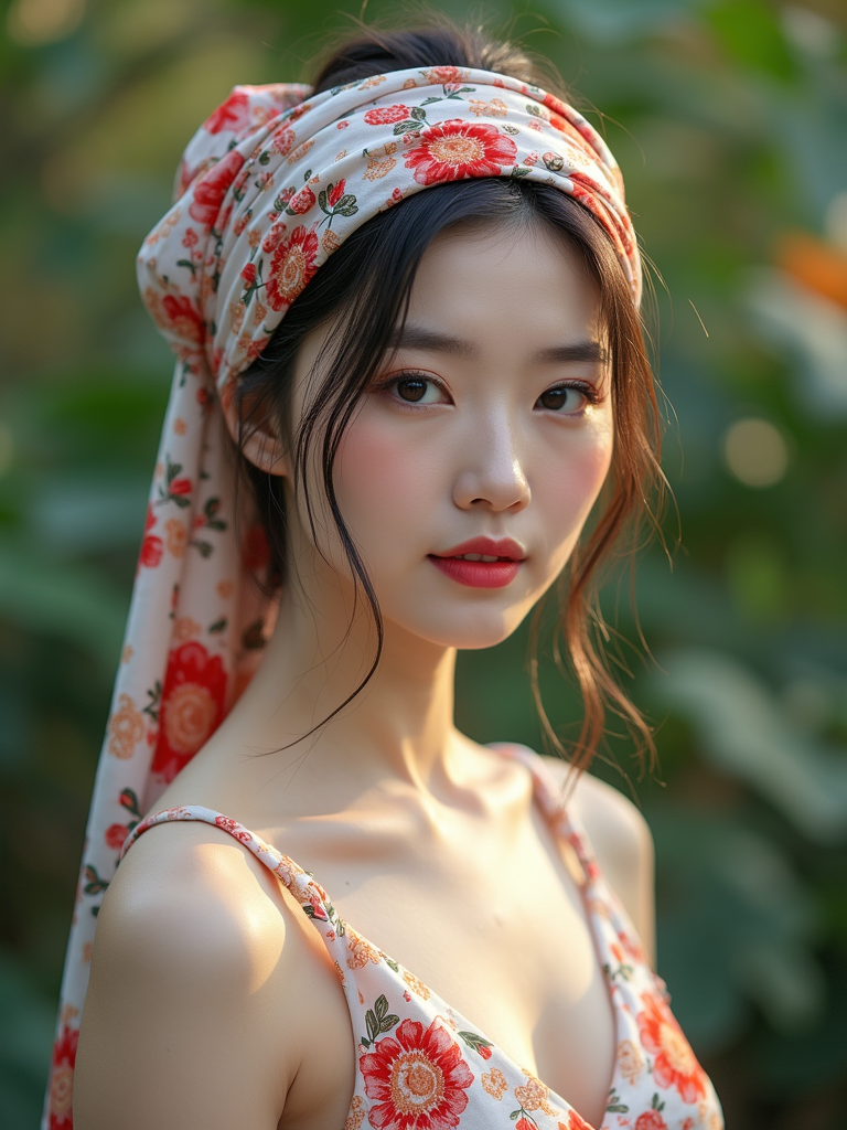 model with a floral silk scarf wrapped around the head covering all hair, with natural-looking makeup , in a botanical garden setting