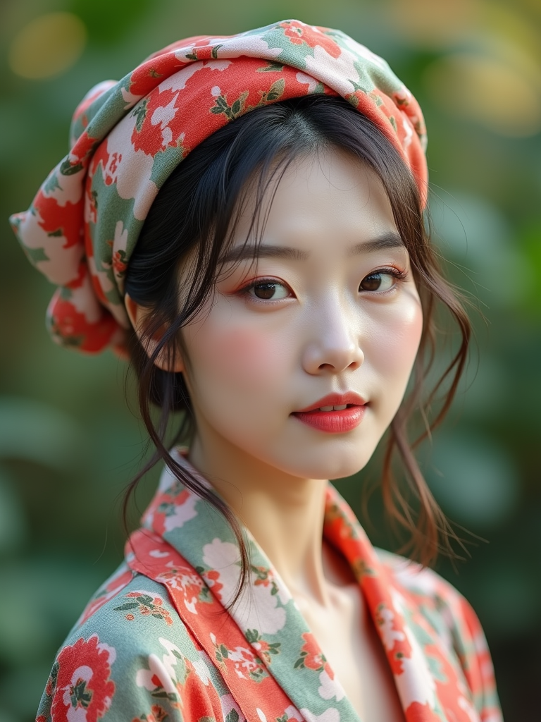 model with a floral silk scarf wrapped around the head covering all hair, with natural-looking makeup , in a botanical garden setting