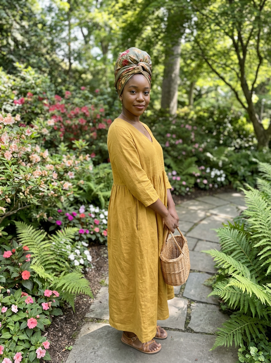 model with a floral silk scarf wrapped around the head covering all hair, with natural-looking makeup , in a botanical garden setting