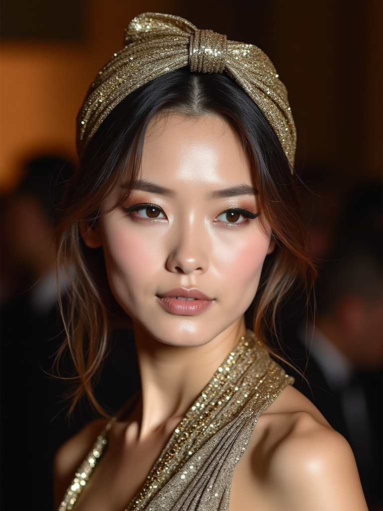 model with a metallic-threaded silk scarf tied to fully cover the hair, with smokey eye makeup , at an evening event