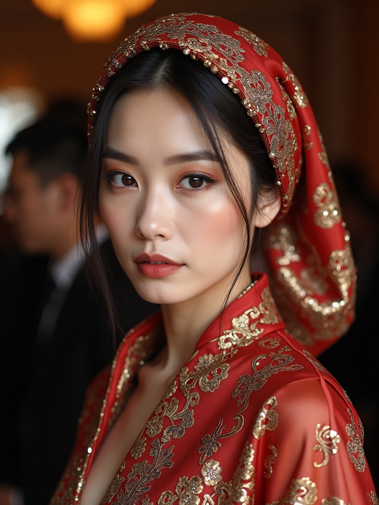 model with a metallic-threaded silk scarf tied to fully cover the hair, with smokey eye makeup , at an evening event