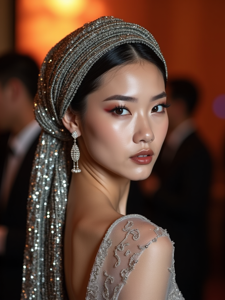 model with a metallic-threaded silk scarf tied to fully cover the hair, with smokey eye makeup , at an evening event