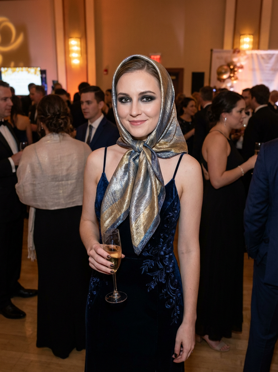 model with a metallic-threaded silk scarf tied to fully cover the hair, with smokey eye makeup , at an evening event