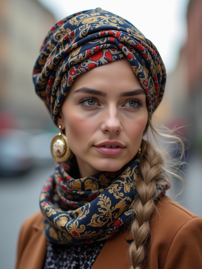 model with a patterned silk scarf tied in a complete turban style covering all hair, with statement earrings , against a neutral urban background