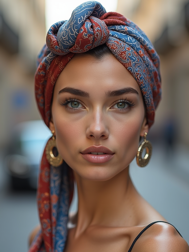 model with a patterned silk scarf tied in a complete turban style covering all hair, with statement earrings , against a neutral urban background