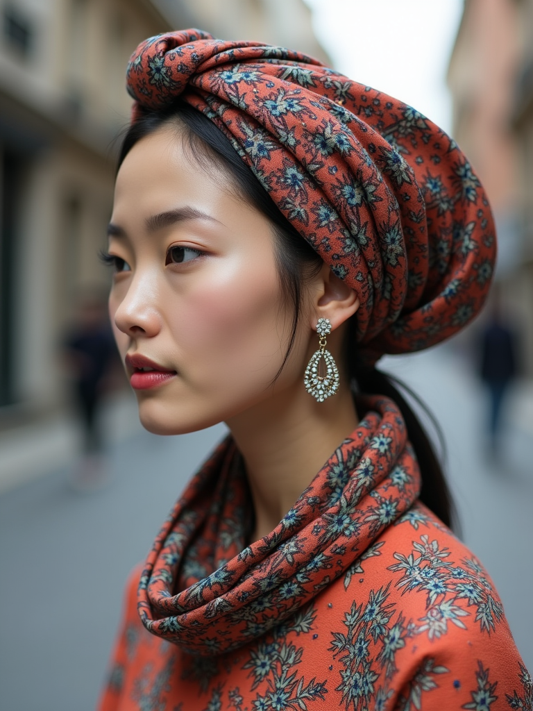 model with a patterned silk scarf tied in a complete turban style covering all hair, with statement earrings , against a neutral urban background