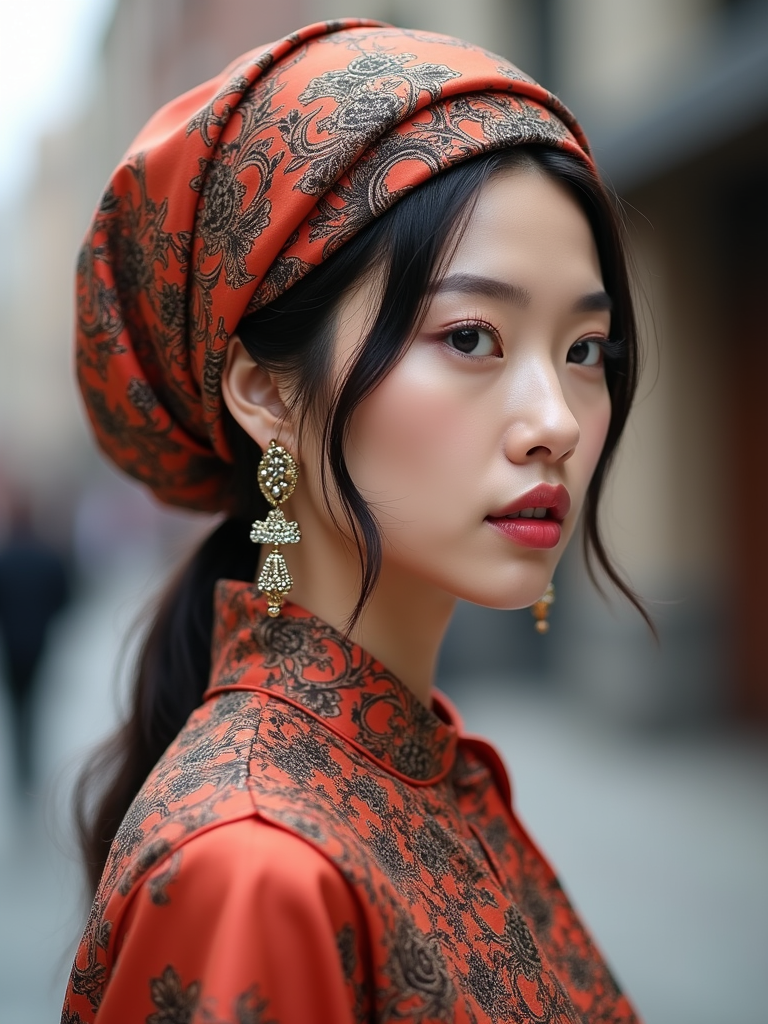 model with a patterned silk scarf tied in a complete turban style covering all hair, with statement earrings , against a neutral urban background