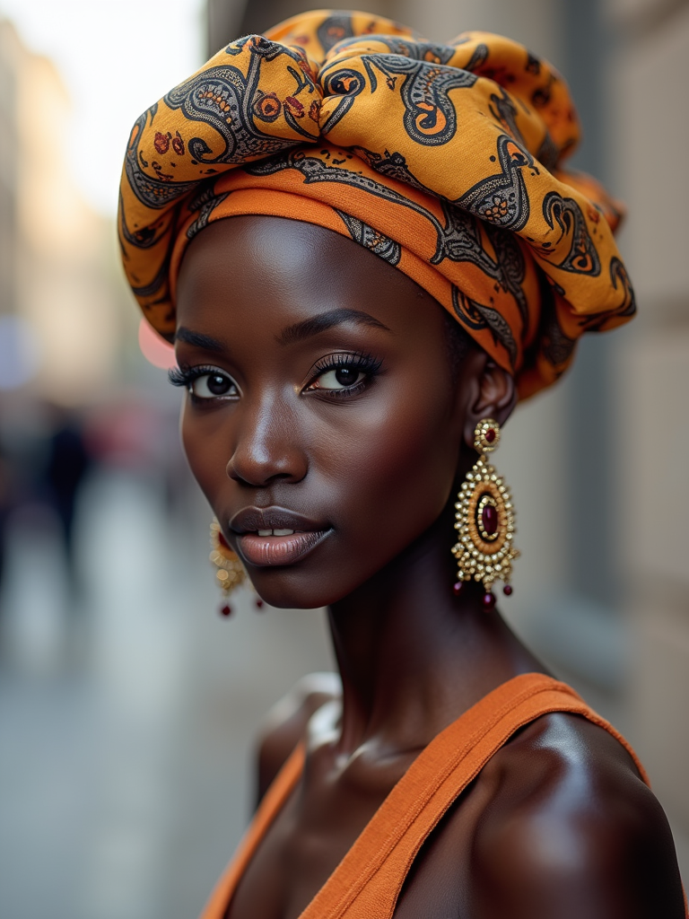 model with a patterned silk scarf tied in a complete turban style covering all hair, with statement earrings , against a neutral urban background