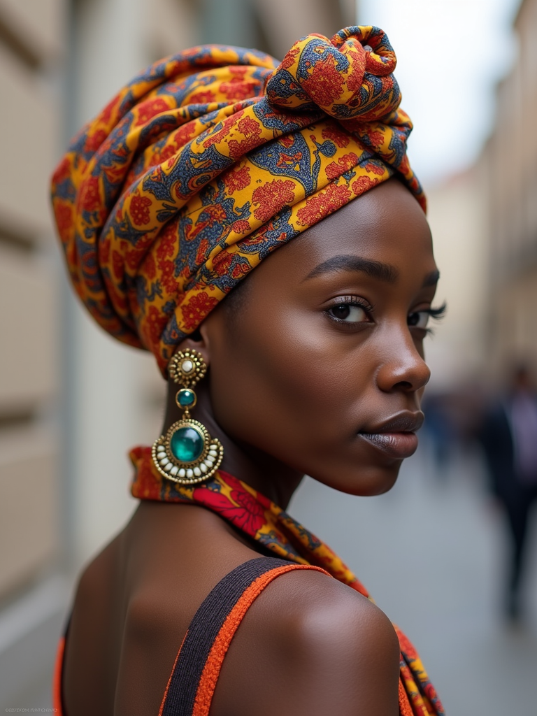 model with a patterned silk scarf tied in a complete turban style covering all hair, with statement earrings , against a neutral urban background