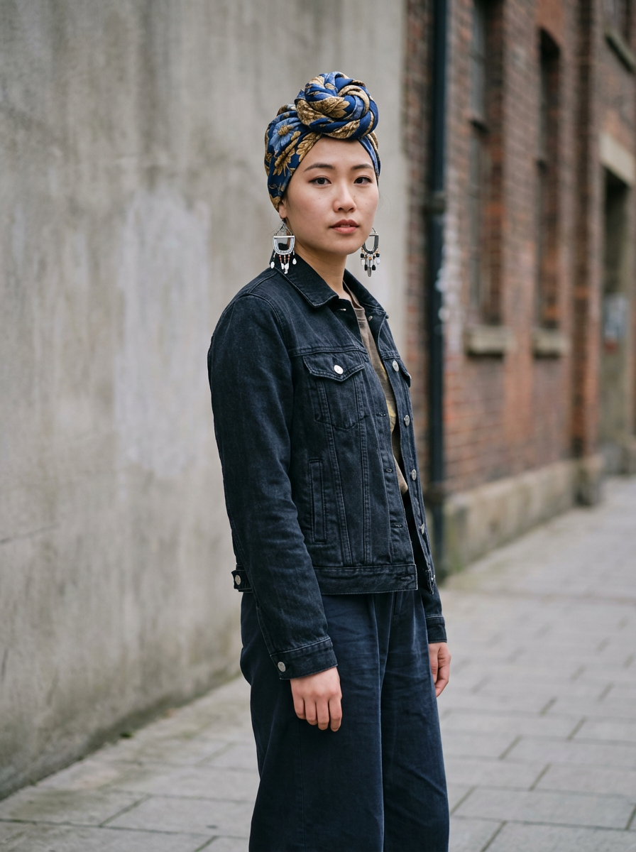 model with a patterned silk scarf tied in a complete turban style covering all hair, with statement earrings , against a neutral urban background