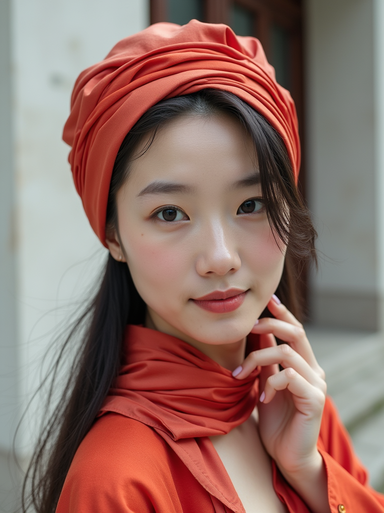 model with a two-toned silk scarf styled as a complete headwrap covering all hair, with dewy skin , against a minimalist architectural background