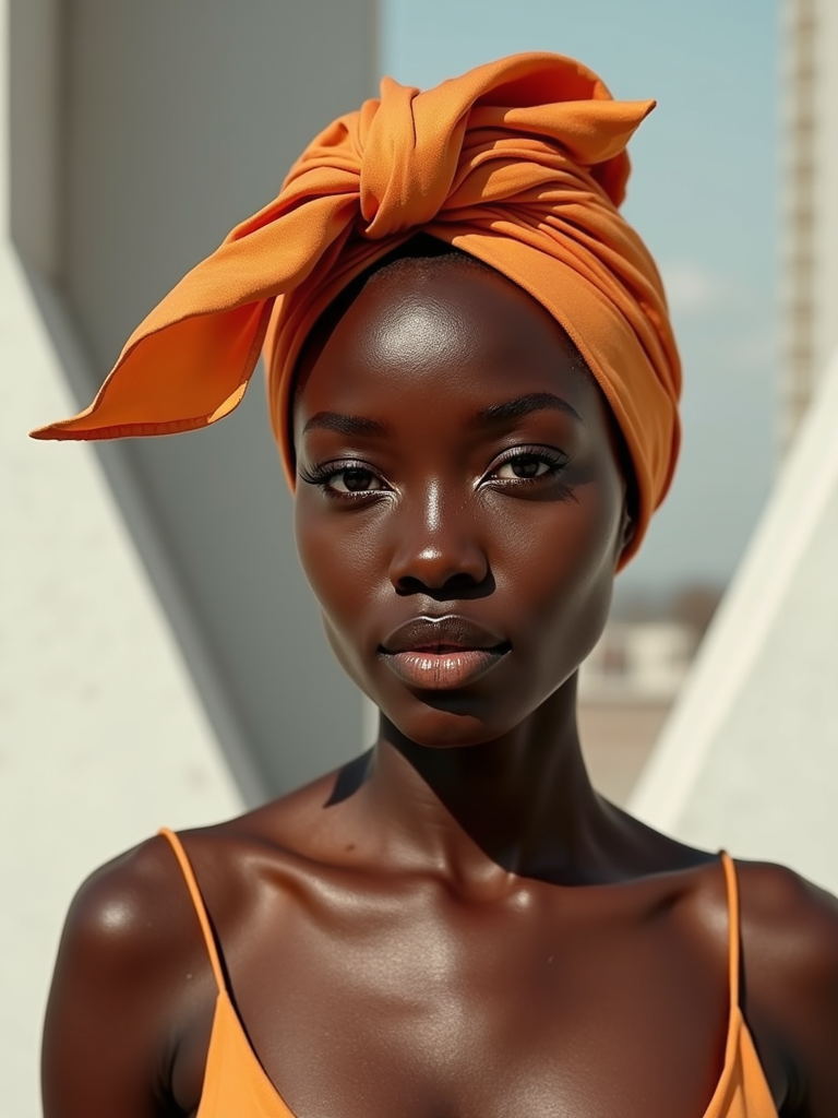 model with a two-toned silk scarf styled as a complete headwrap covering all hair, with dewy skin , against a minimalist architectural background