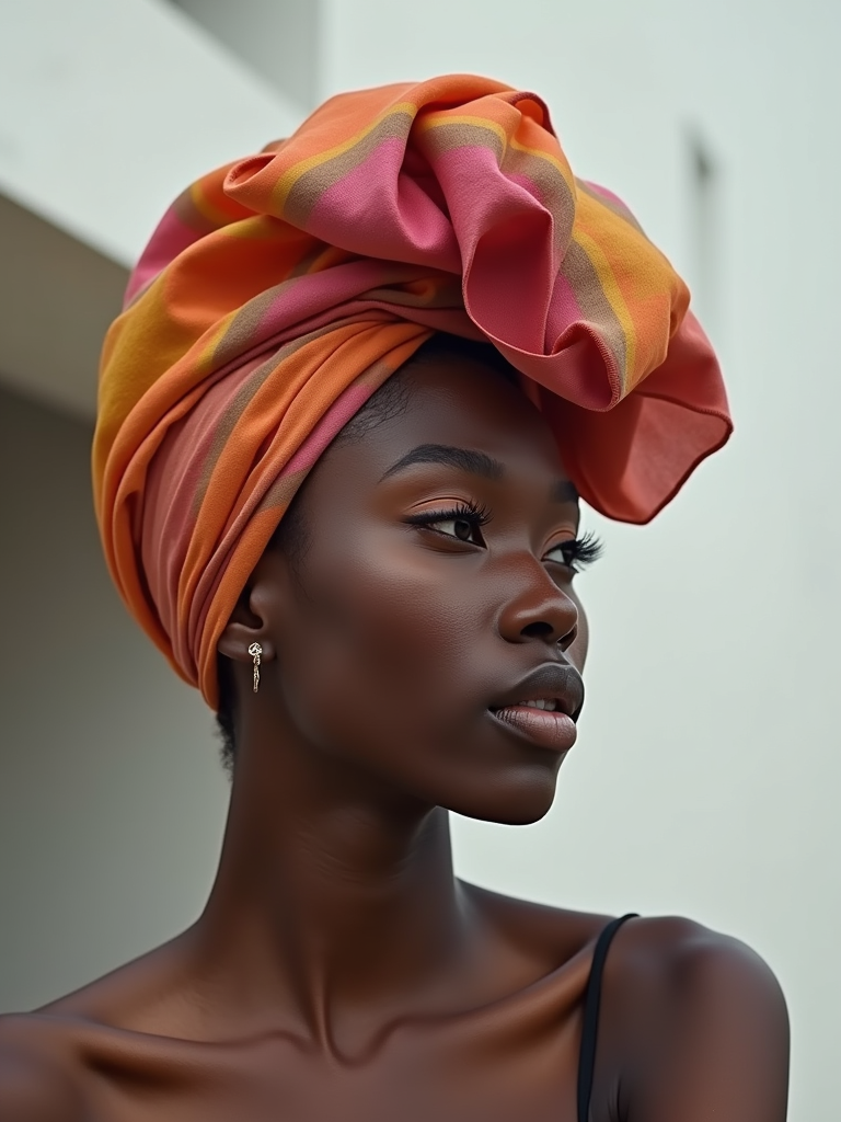 model with a two-toned silk scarf styled as a complete headwrap covering all hair, with dewy skin , against a minimalist architectural background