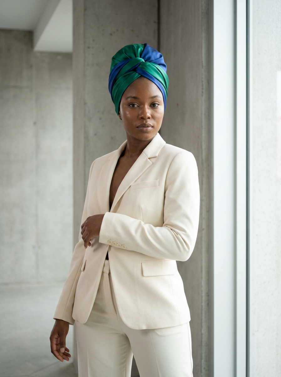 model with a two-toned silk scarf styled as a complete headwrap covering all hair, with dewy skin , against a minimalist architectural background