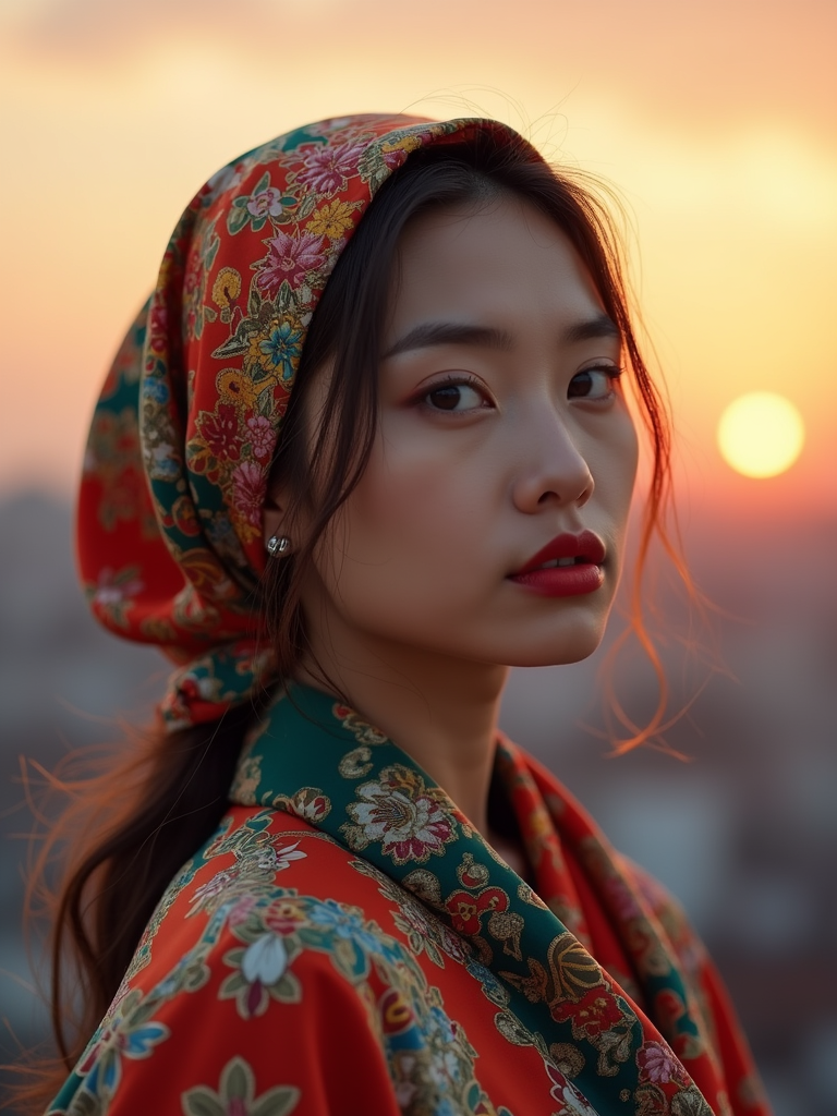 model with an abstract print silk scarf wrapped completely around the head, with bold lipstick , against a sunset skyline
