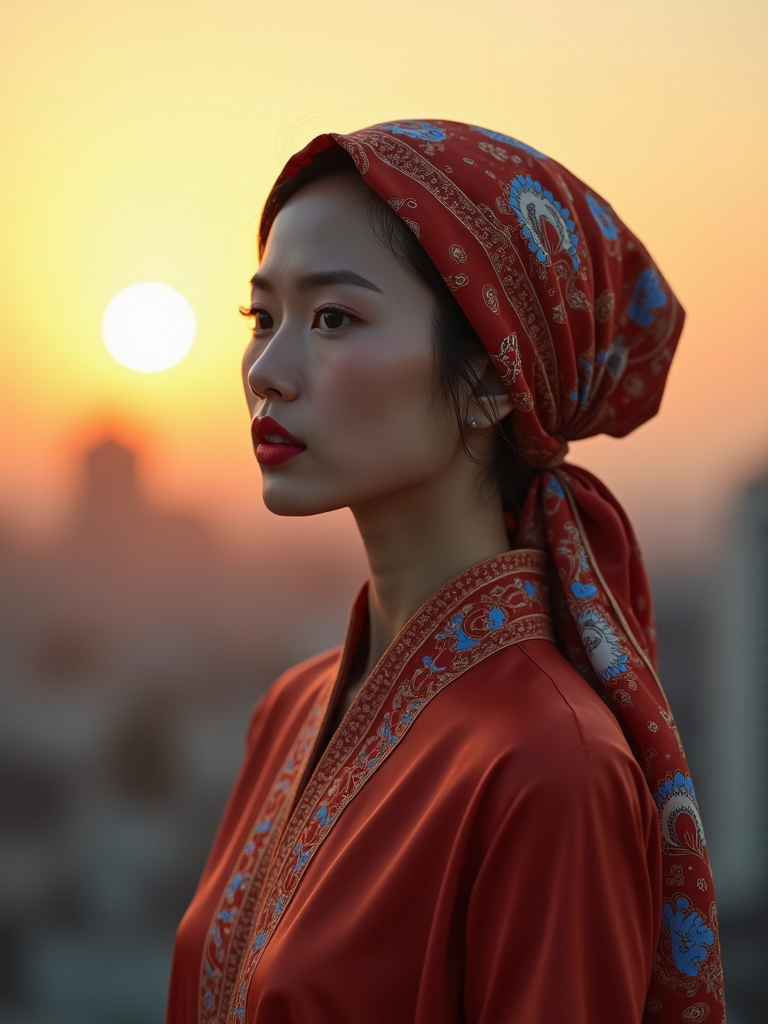 model with an abstract print silk scarf wrapped completely around the head, with bold lipstick , against a sunset skyline