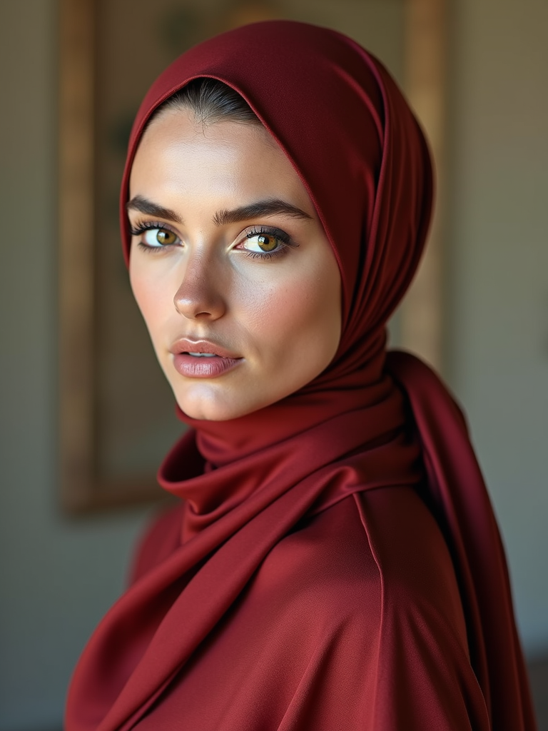 model with an elegant solid-colored silk scarf tied to completely cover the hair, with a sophisticated makeup look , in an art gallery setting