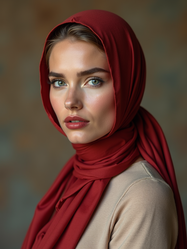 model with an elegant solid-colored silk scarf tied to completely cover the hair, with a sophisticated makeup look , in an art gallery setting