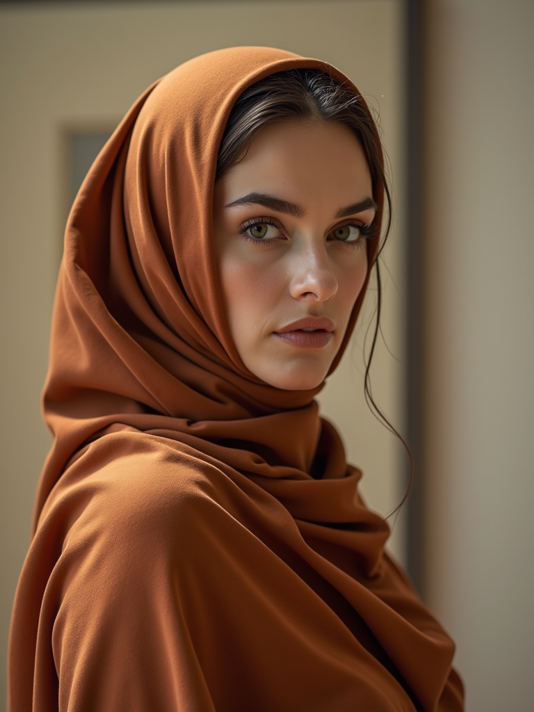 model with an elegant solid-colored silk scarf tied to completely cover the hair, with a sophisticated makeup look , in an art gallery setting