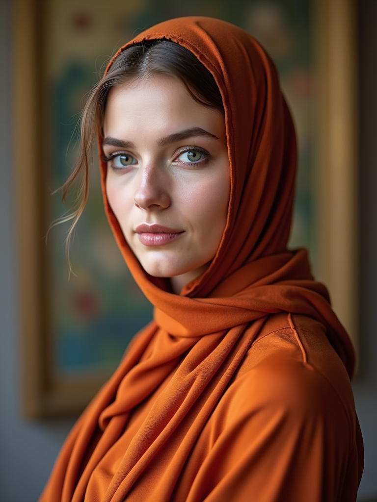 model with an elegant solid-colored silk scarf tied to completely cover the hair, with a sophisticated makeup look , in an art gallery setting