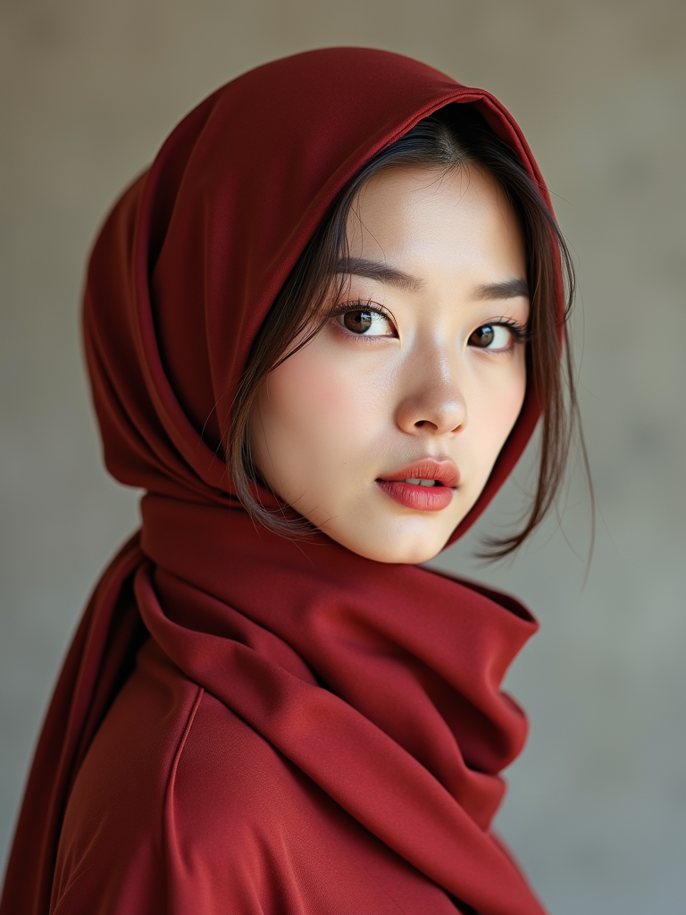 model with an elegant solid-colored silk scarf tied to completely cover the hair, with a sophisticated makeup look , in an art gallery setting
