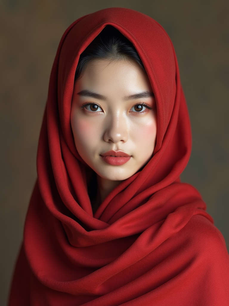 model with an elegant solid-colored silk scarf tied to completely cover the hair, with a sophisticated makeup look , in an art gallery setting