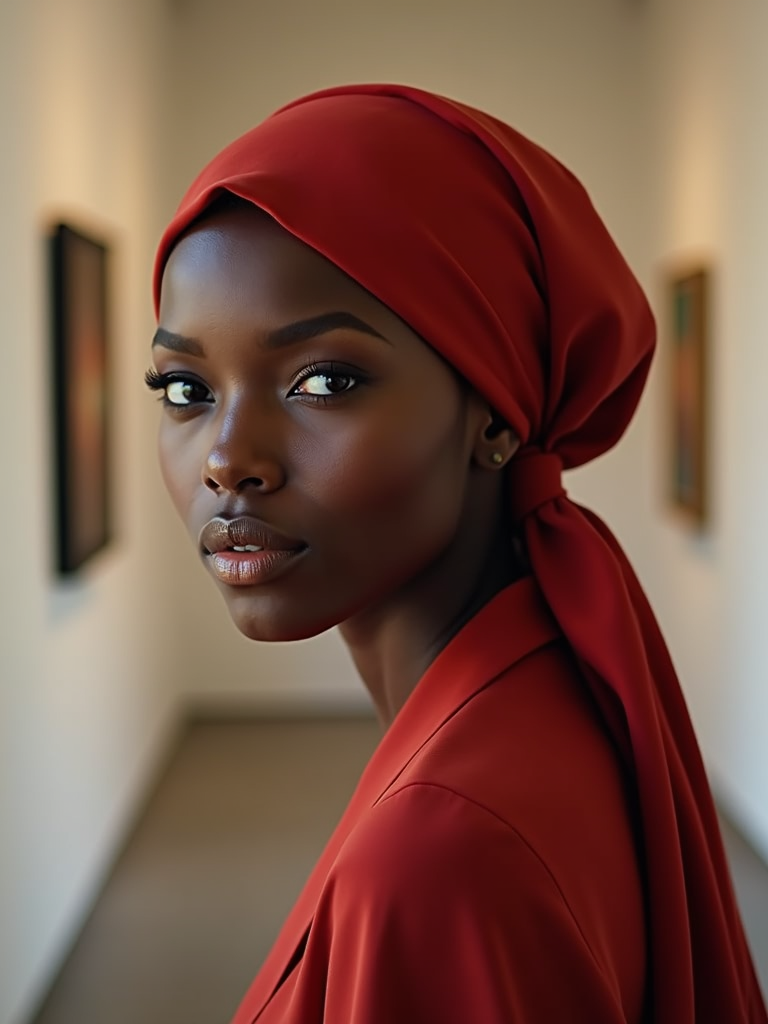 model with an elegant solid-colored silk scarf tied to completely cover the hair, with a sophisticated makeup look , in an art gallery setting