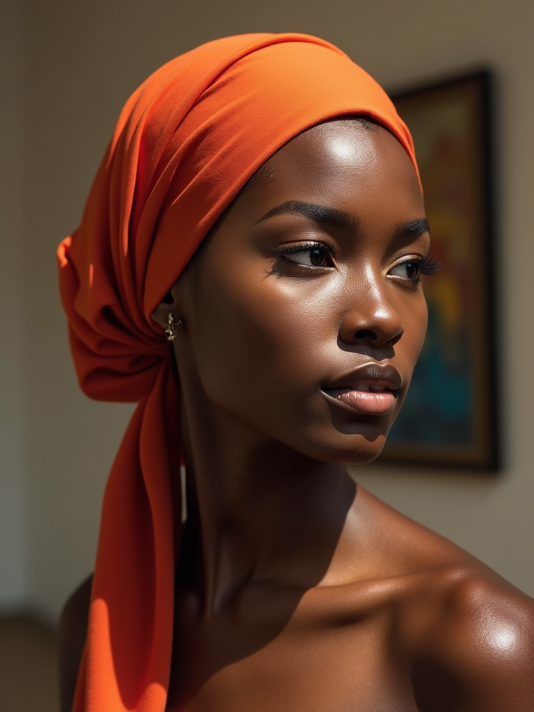 model with an elegant solid-colored silk scarf tied to completely cover the hair, with a sophisticated makeup look , in an art gallery setting