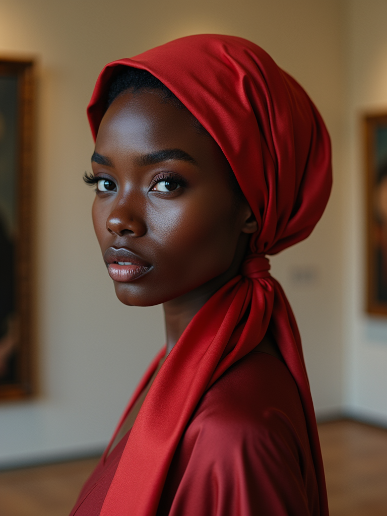 model with an elegant solid-colored silk scarf tied to completely cover the hair, with a sophisticated makeup look , in an art gallery setting