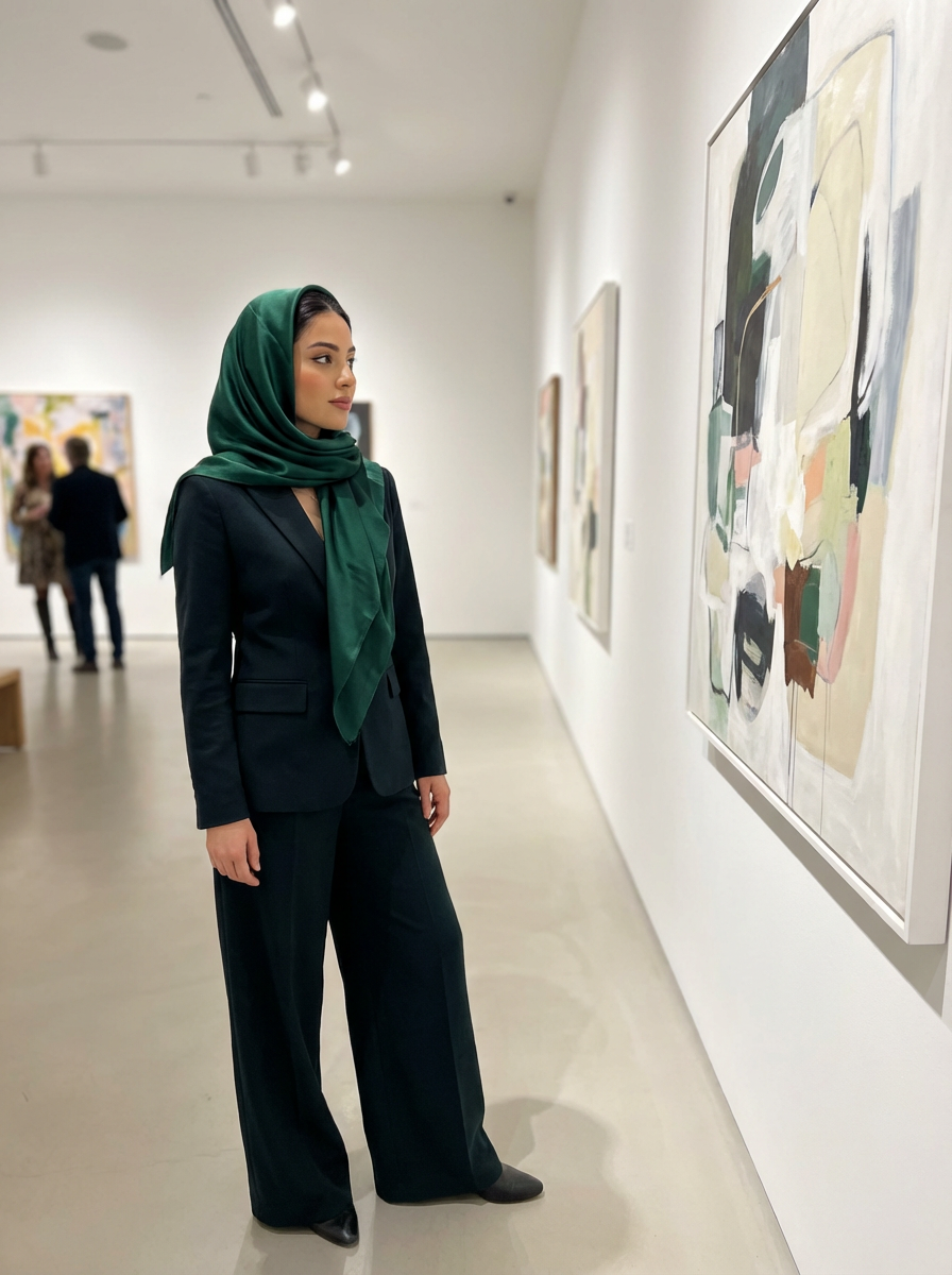 model with an elegant solid-colored silk scarf tied to completely cover the hair, with a sophisticated makeup look , in an art gallery setting