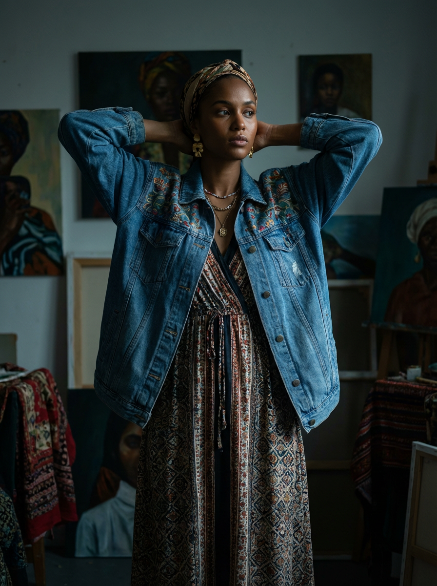 model with artistic creative expression, bohemian chic style , moody artistic lighting