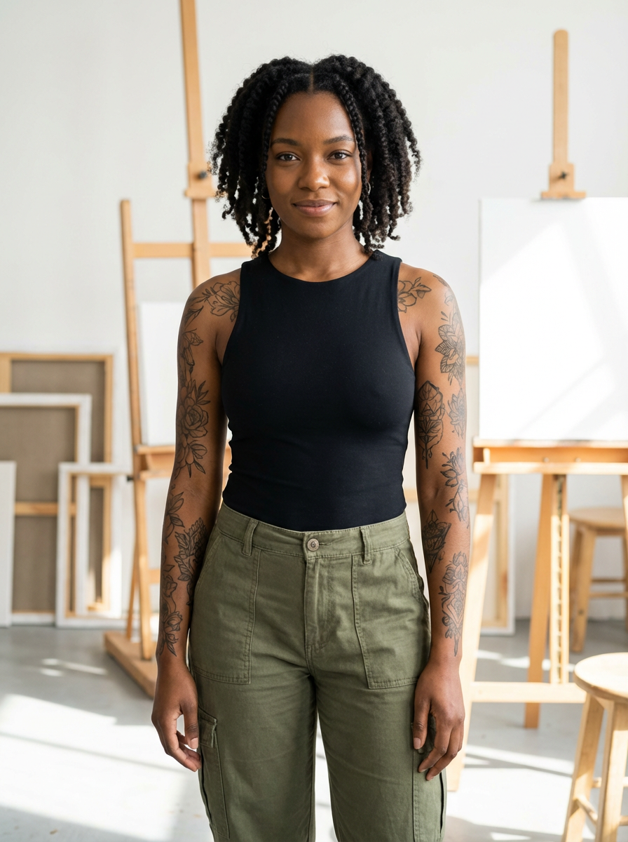 model with artistic tattoos visible, tasteful creative ink , confident display