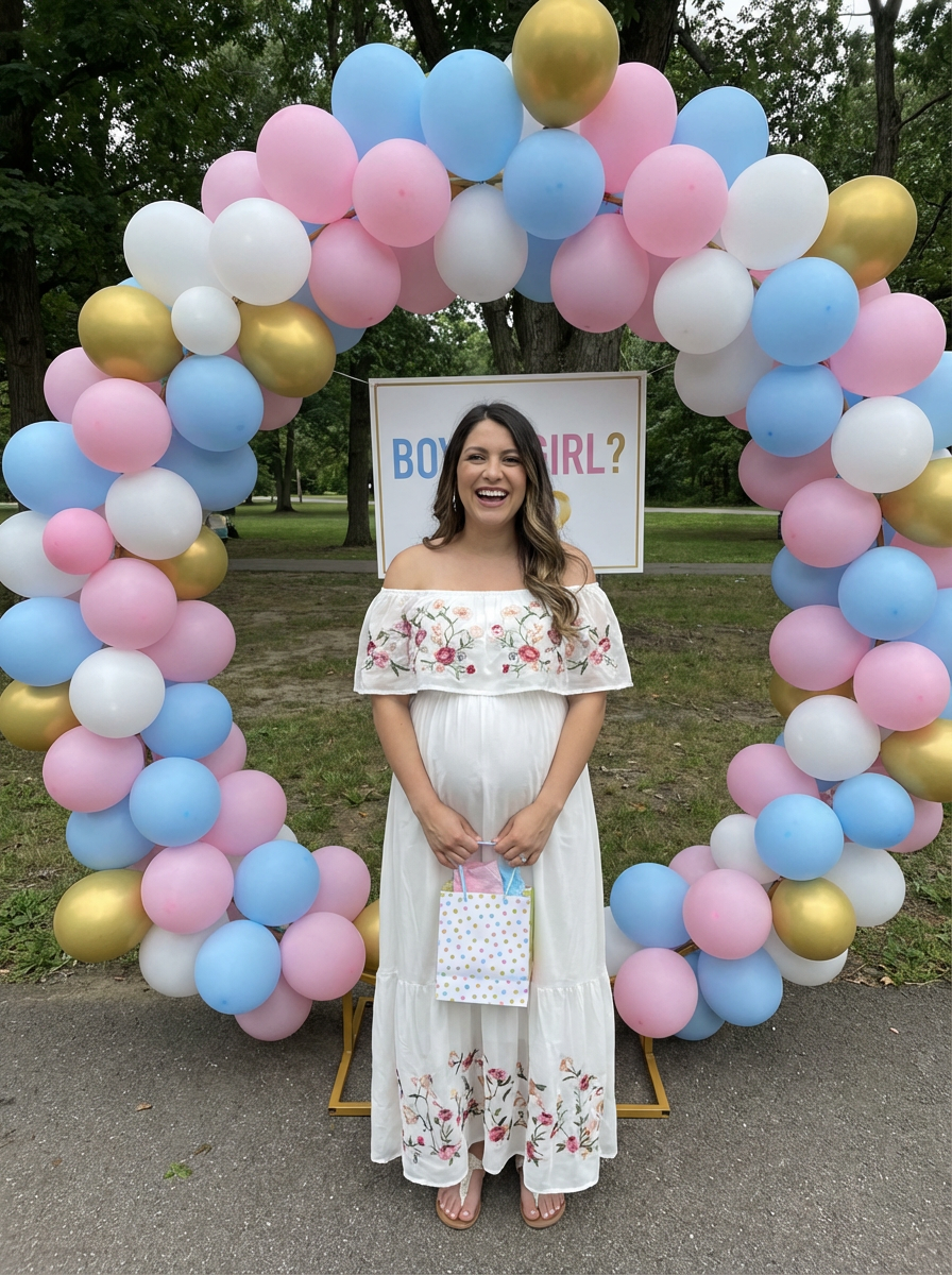 model with baby shower balloon arch, gender reveal colors, stylish maternity or parent outfit