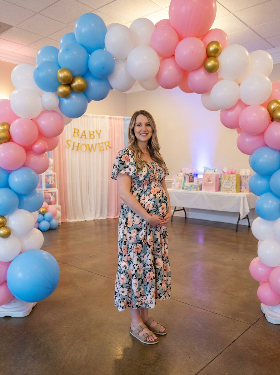 model with baby shower balloon arch, gender reveal colors, stylish maternity or parent outfit