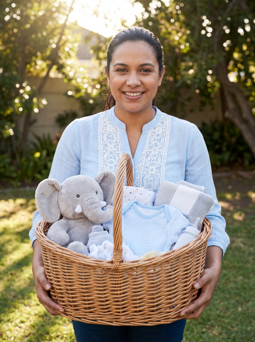 model with baby shower gift basket, adorable baby items, grateful happy expression