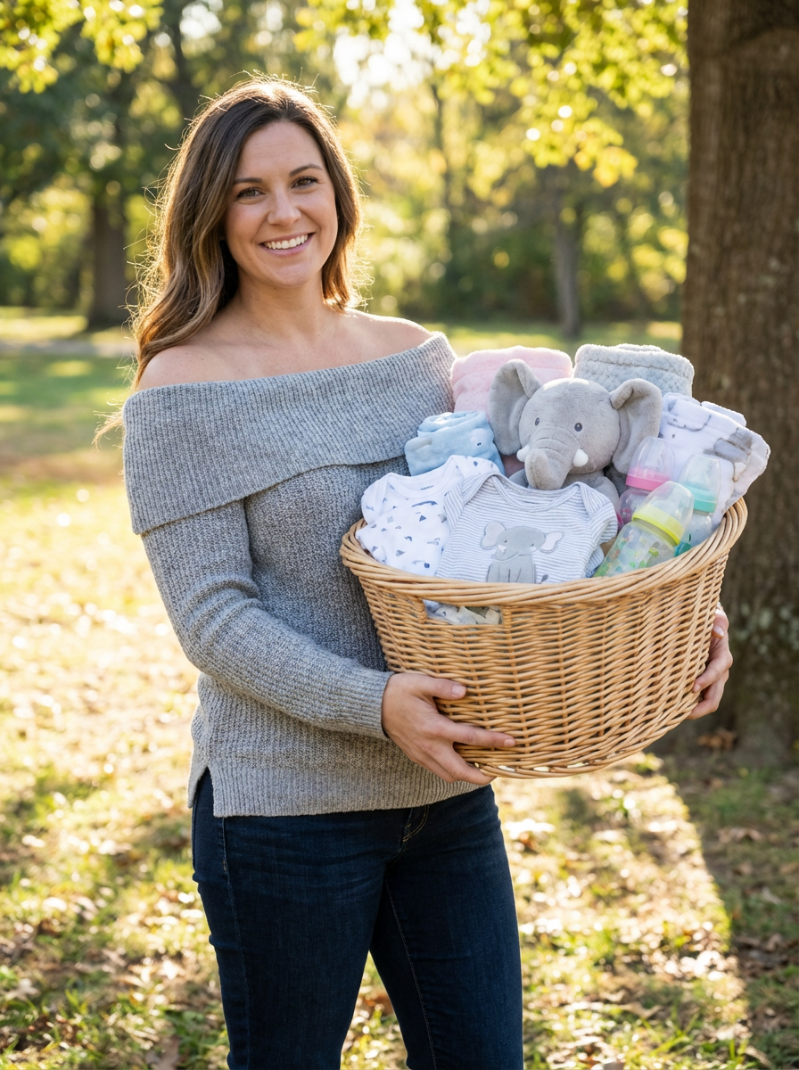 model with baby shower gift basket, adorable baby items, grateful happy expression