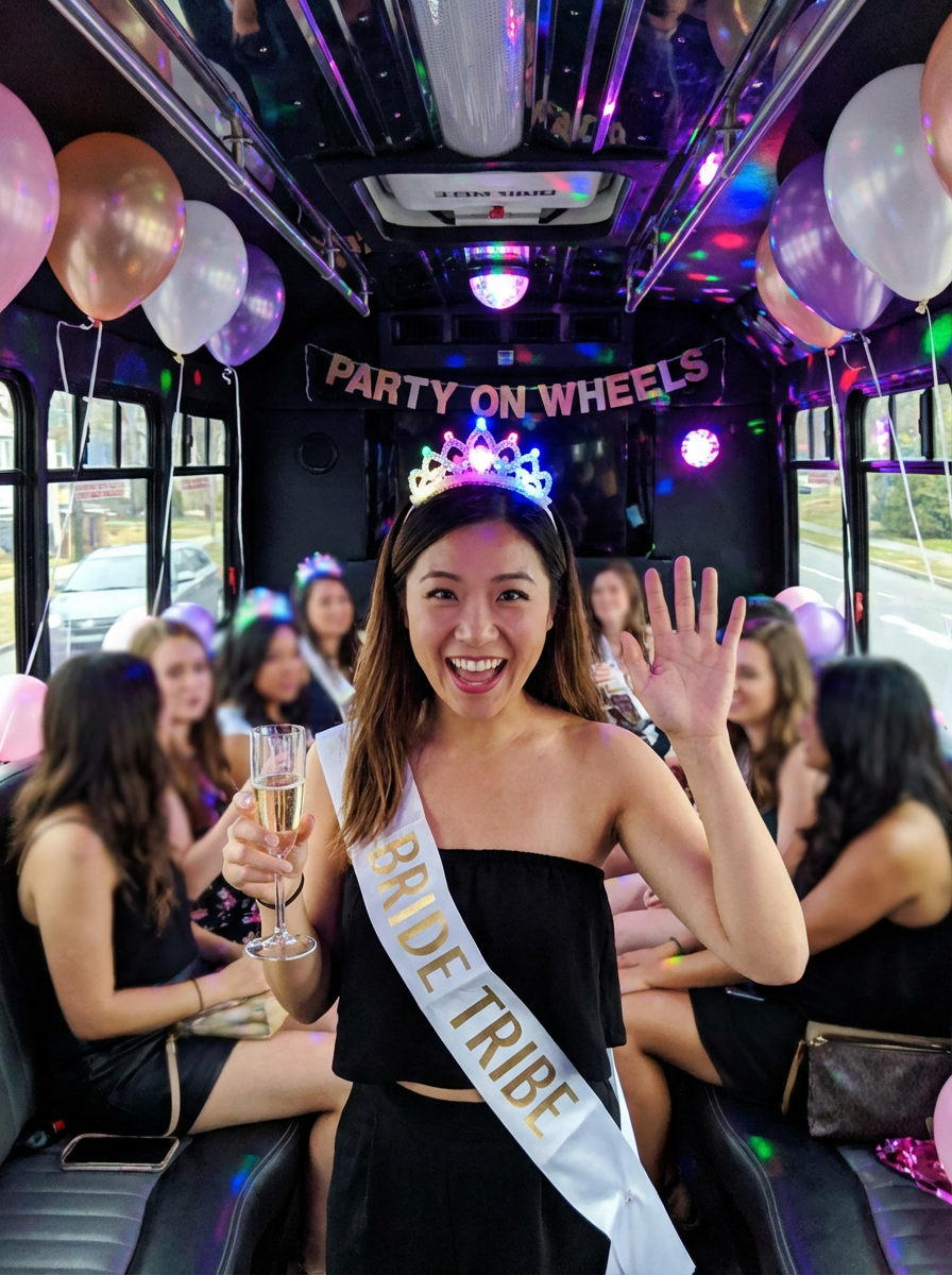 model with bachelorette party bus, party on wheels, bride tribe ready to celebrate, excited poses