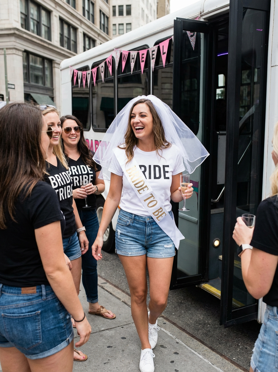 model with bachelorette party bus, party on wheels, bride tribe ready to celebrate, excited poses