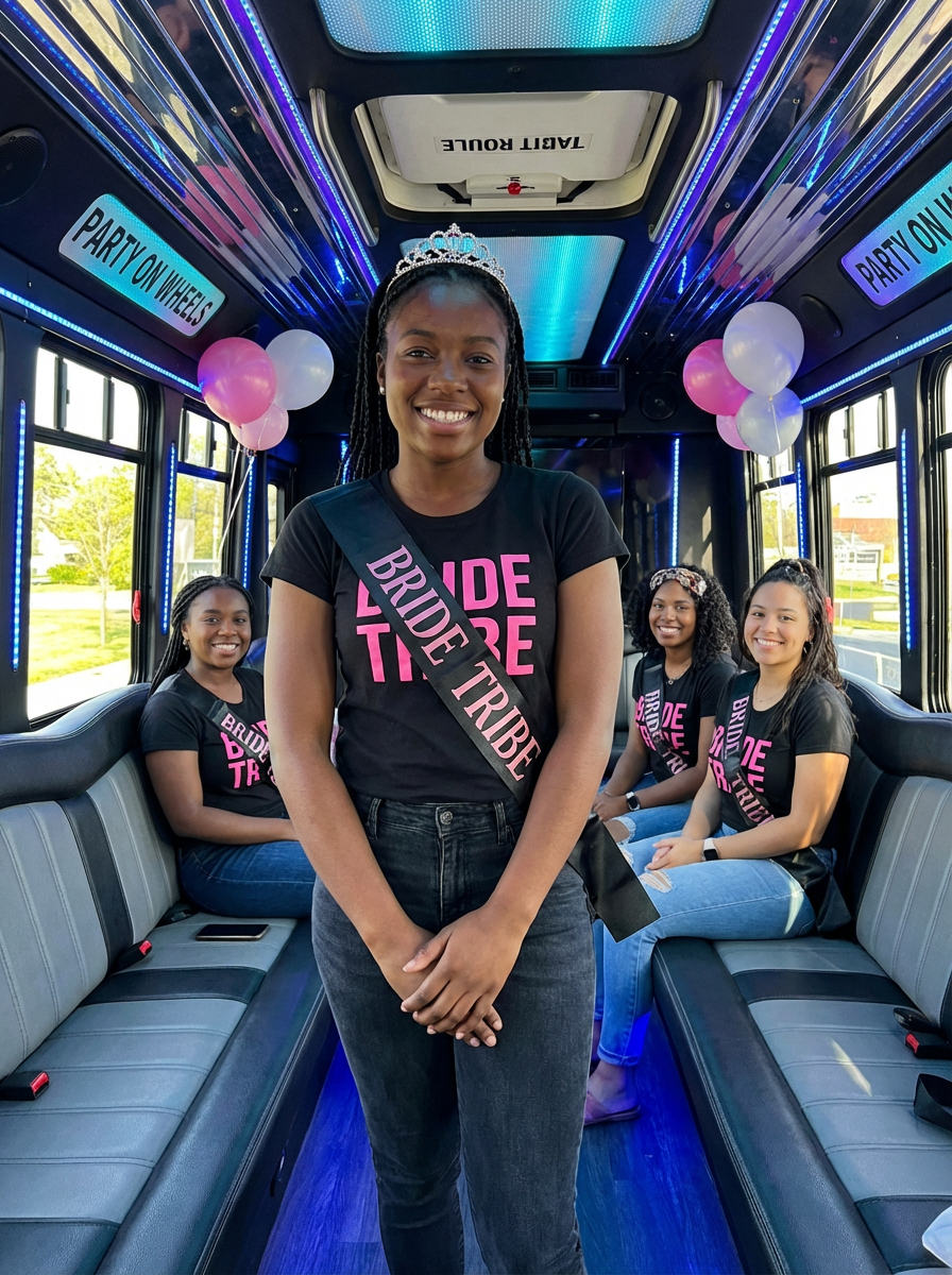 model with bachelorette party bus, party on wheels, bride tribe ready to celebrate, excited poses